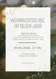 Am Samstag, den 3. Januar 2026 begrüßt Michelle Wong um 17 Uhr in der Gnadenkirche mit Orgelmusik das neue Jahr. Gemeinsam möchten wir noch einmal die Freude und den Zauber der Weihnachtsmusik genießen, bevor die Weihnachtszeit – je nach Tradition am 6. Januar oder am 2. Februar – ihren Abschluss findet.Vom Weihnachtsgedicht “Goldener Baum” (Albrecht Goes) inspiriert, hören wir noch einmal „Macht hoch die Tür“, „Stille Nacht“ und mehr, bevor der Weihnachtsbaum vielerorts abgebaut wird.