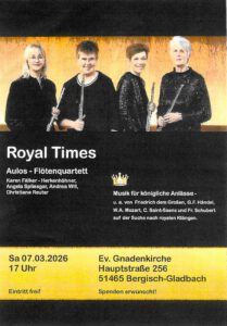 lädt das Aulos Flötenquartett mit Karen Fälker-Herkenhöhner, Angela Spliesgar, Christiane Reuter und Andrea Will zu einer musikalischen Audienz in die Evangelische Gnadenkirche in Bergisch Gladbach ein. Unter dem klangvollen Titel „Royal Times“ erwartet das Publikum ein Konzert ganz im Zeichen höfischer Eleganz, feinsinniger Noblesse und britischer Klangpracht.